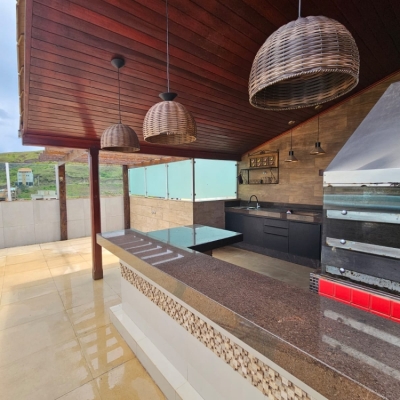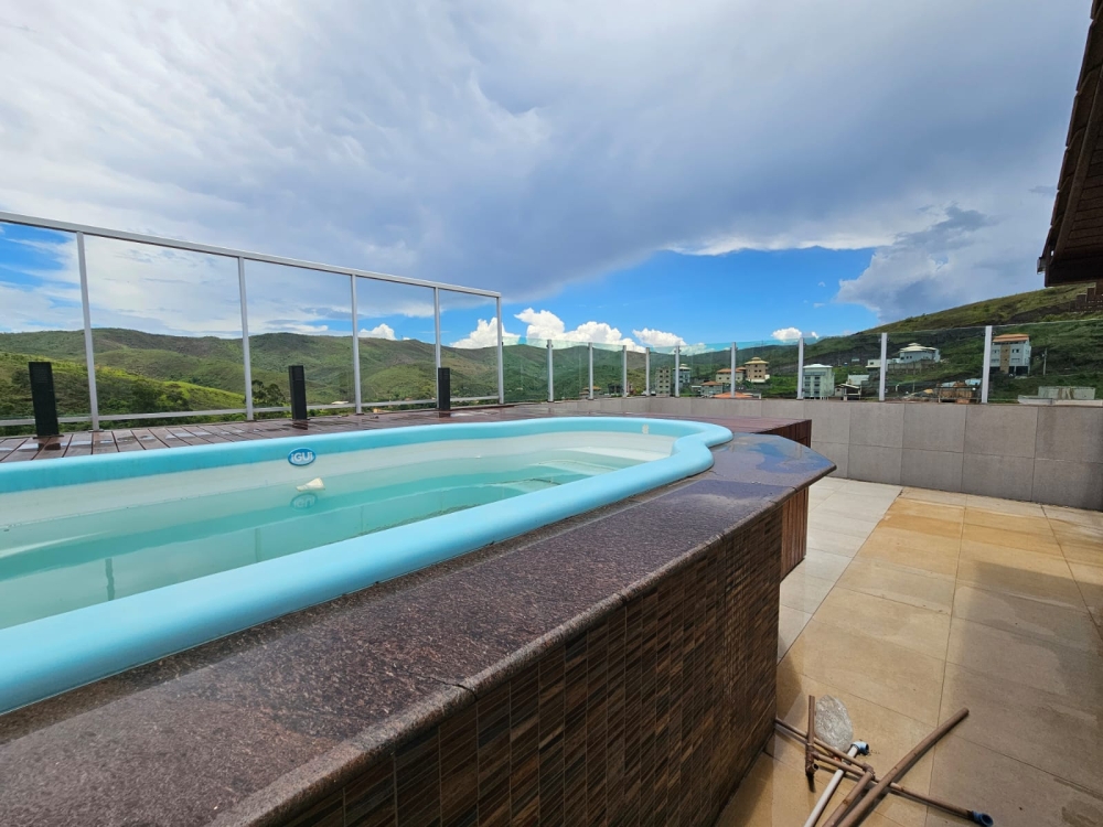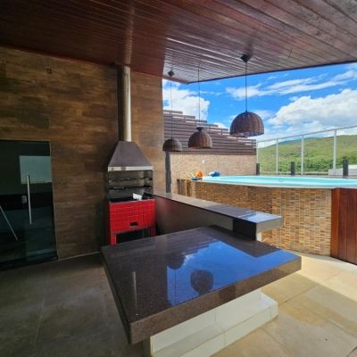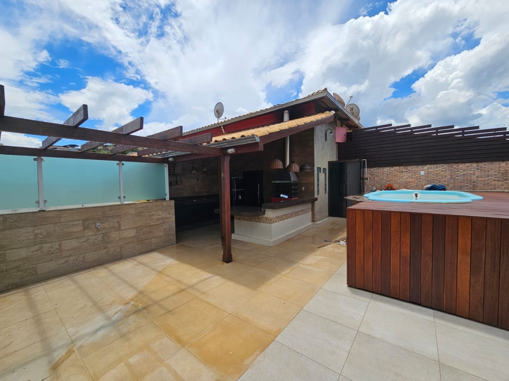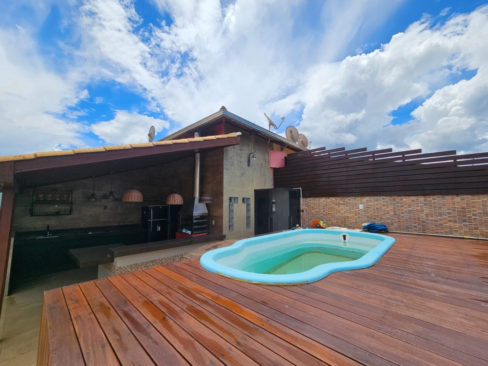Área Gourmet na cobertura com piscina, churrasqueira, área privativa, banheiro social.