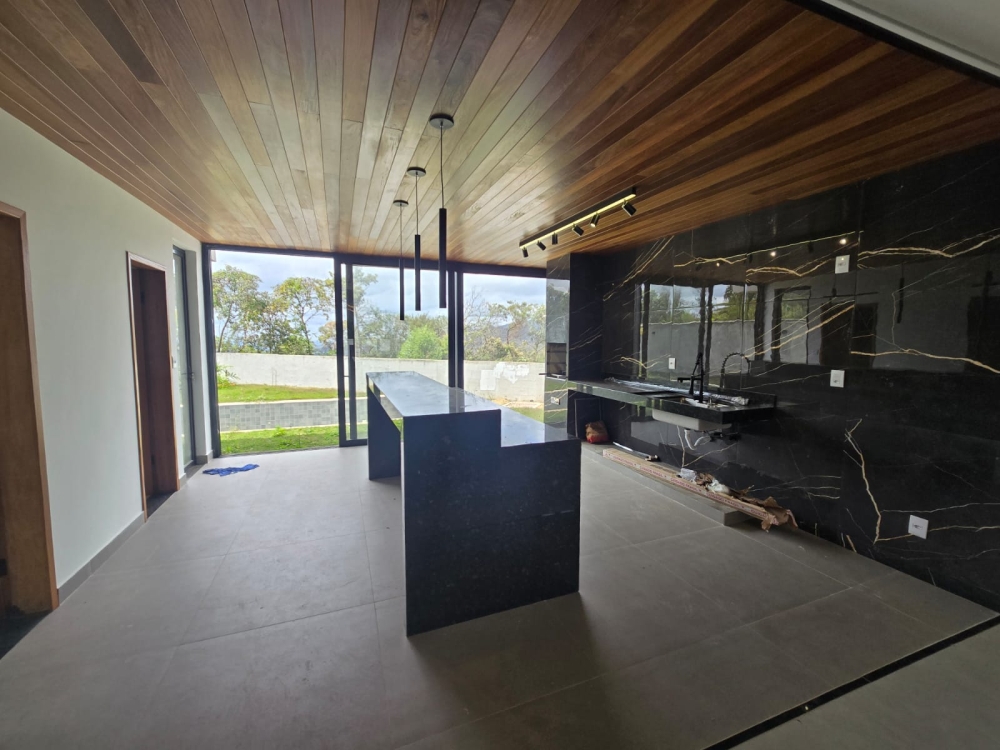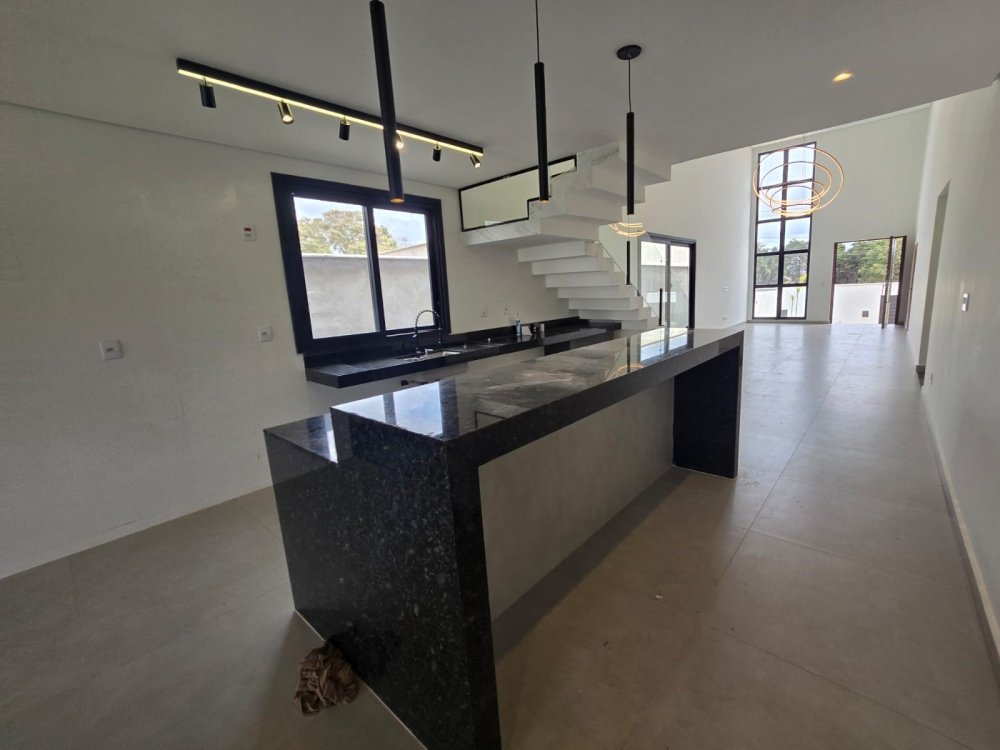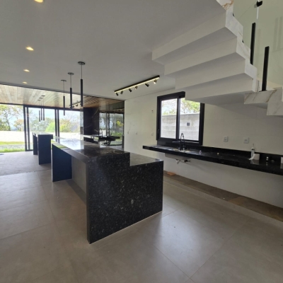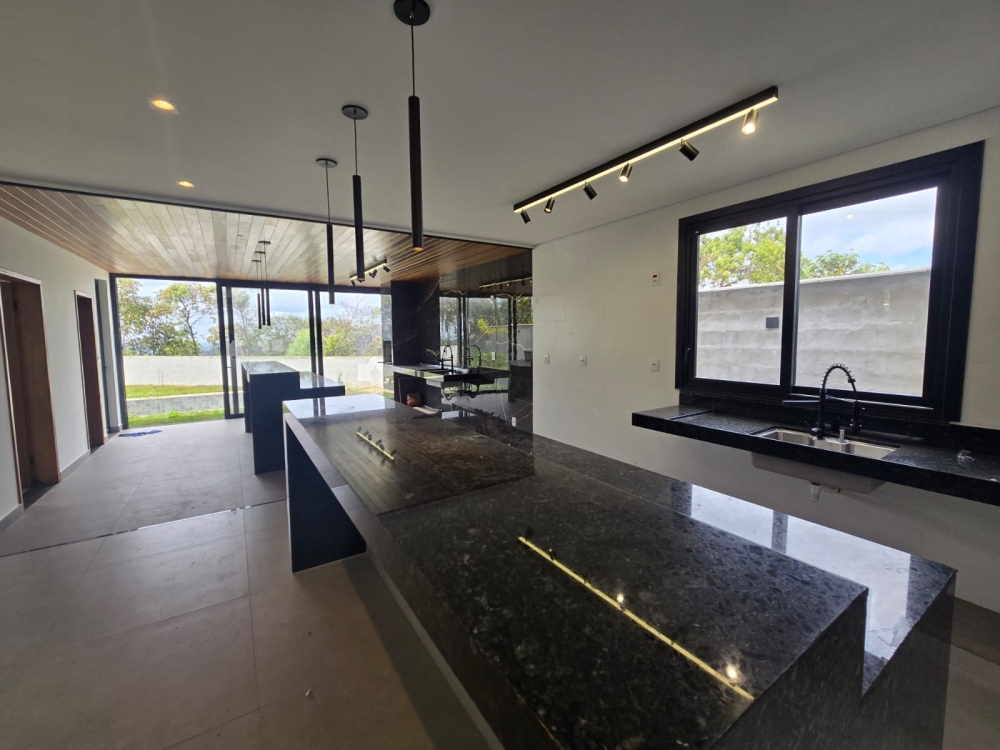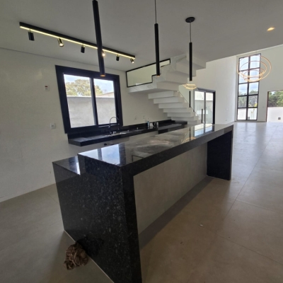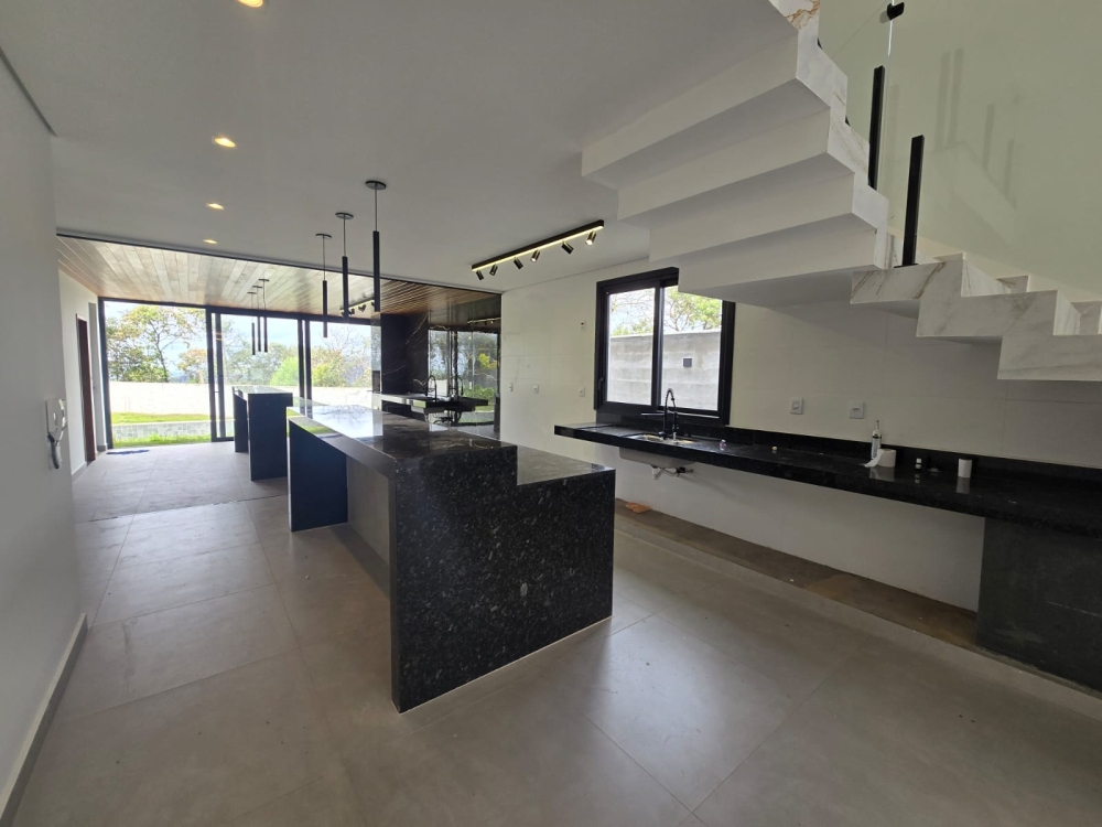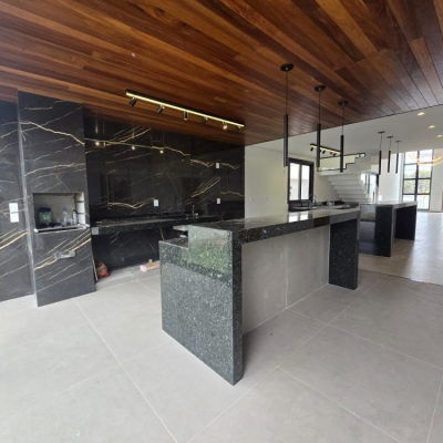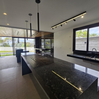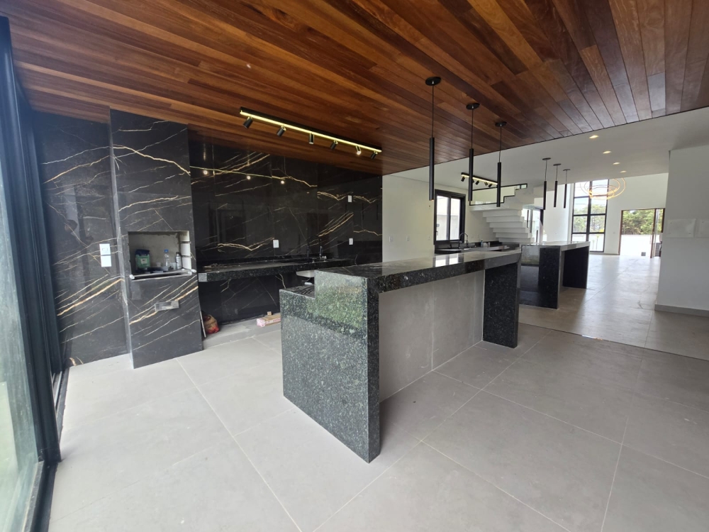 Cozinha ampla integrada com a área gourmet com ilha central em granito de alto padrão
