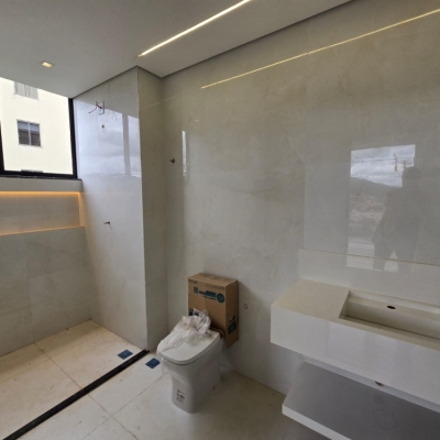 3 quartos amplos com pre disposiçãoparaar condicionado, sendo 1 suite com 2 chuveiros