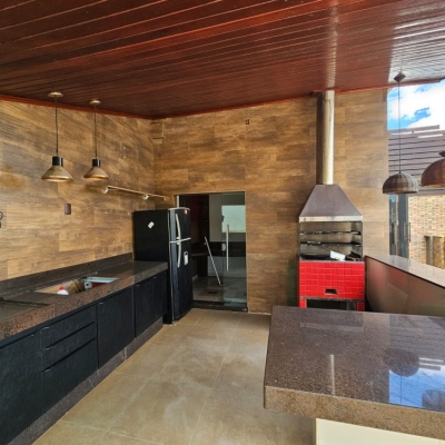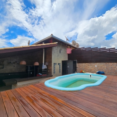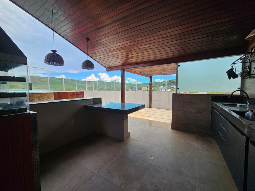 Área Gourmet na cobertura com piscina, churrasqueira, área privativa, banheiro social.